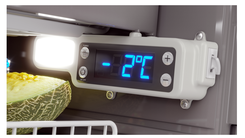 • Display con 6 opciones de ajuste de brillo, controlador digital y función de enfriamiento turbo con temporizador de apagado automático.